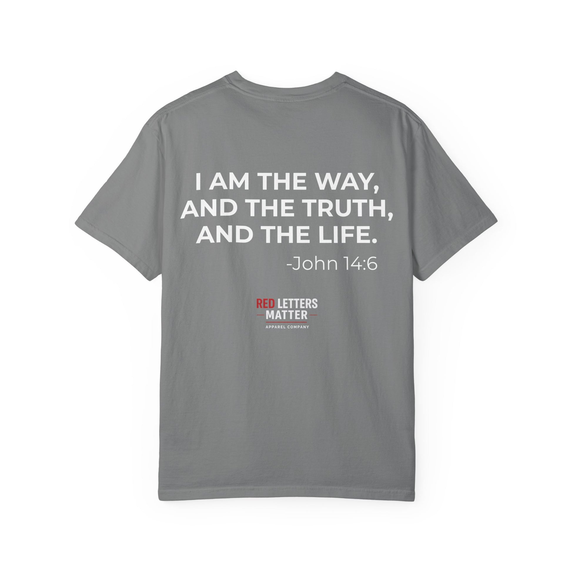 This garment-dyed tee carries a quiet, rooted message: “I am the Way, the Truth, and the Life. John 14:6.” Soft to the touch from post-construction dyeing, it drapes with a relaxed, lived-in feel—like a shirt you reach for when you want comfort and calm. Wear it to Sunday morning gatherings, small group meetups, or while reading and reflecting on the porch. The heavyweight knit and thoughtful construction give it a reassuring heft that holds up to frequent wear. The understated print lets the verse speak gently; pair it with jeans, a cardigan, or layer under an open jacket for cooler evenings. It’s meant for people who want their faith woven into everyday life with honesty and simplicity, not flashy slogans.