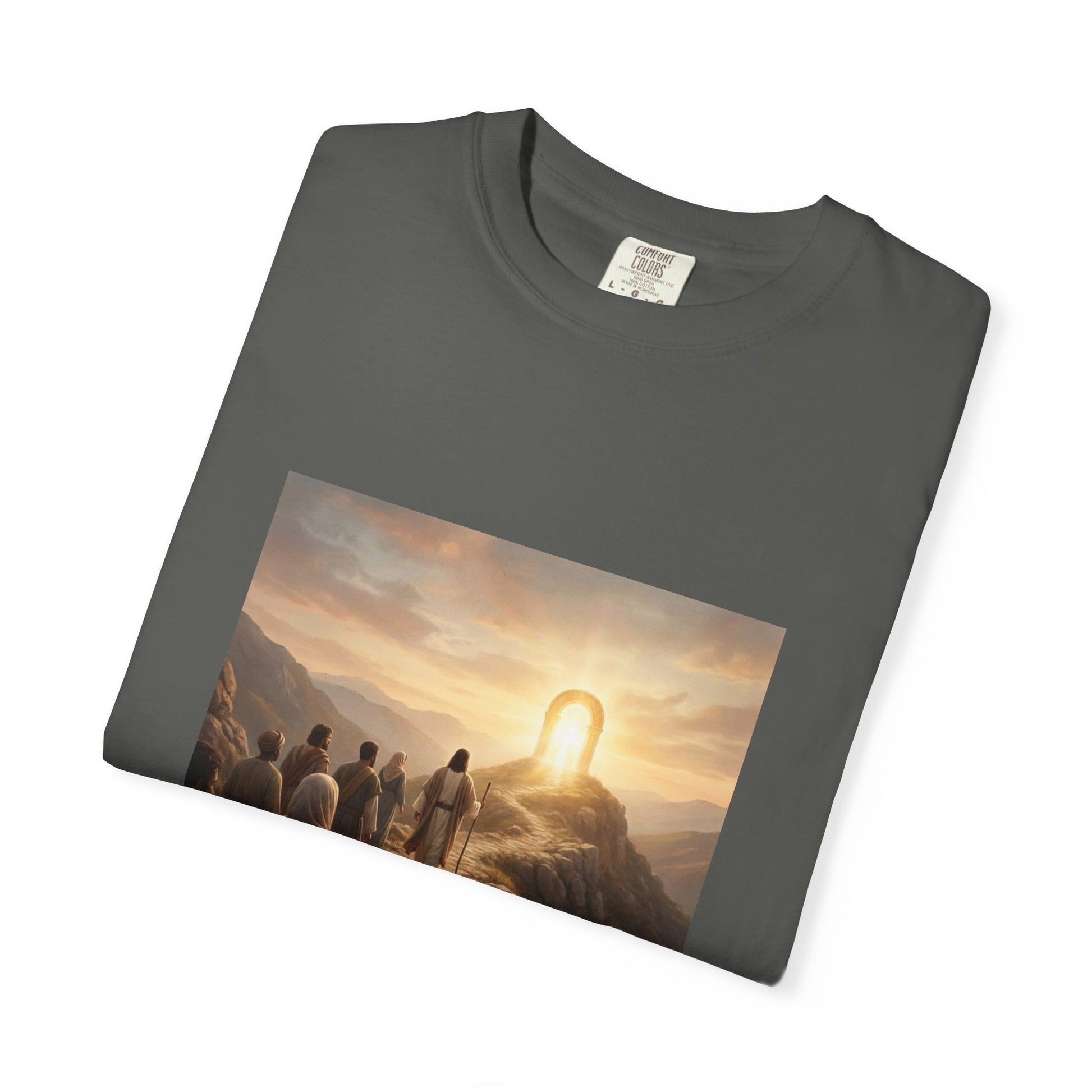 The phrasing fits quiet moments of devotion, neighborhood fellowship, and casual outreach. The soft garment-dyed color tones blend with neutral wardrobes and seasonal layers, so the tee becomes an easy companion from early-fall walks to relaxed spring gatherings.